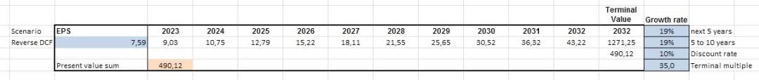 如果我们想看看当前市场对英伟达股价的预期,我们可以进行反向折现现金流 (DCF) 分析,假设如下: