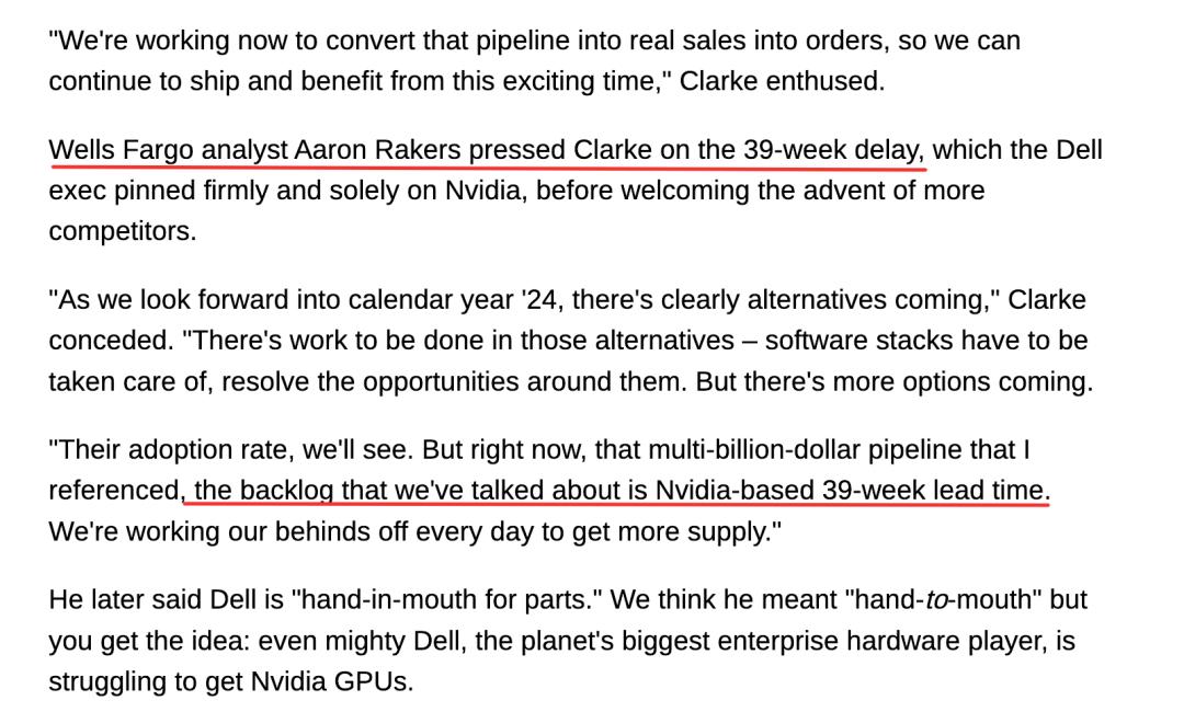 重量级企业戴尔、联想和惠普企业仍在等待 H100 发货,交货时间从 36 周到 52 周不等。英伟达产品的需求仍超过其即时供应。因此,在短期内出现大幅盈利下滑似乎不太可能。
