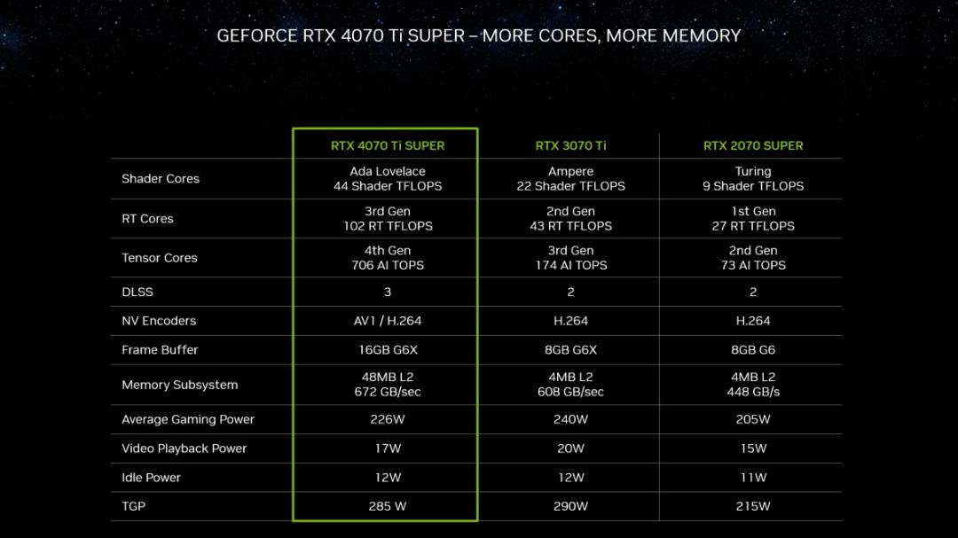 RTX 4070 Ti SUPER - 创作者和游戏双重加持!于2024年1月24日上市,售价799美元起。配备更多CUDA核心和更大显存,使其成为1440P分辨率和4K分辨率下的理想GPU。在游戏中使用DLSS 3技术,速度比GeForce RTX 3070 Ti快1.6倍,图像需求高的游戏中更是快2.5倍。