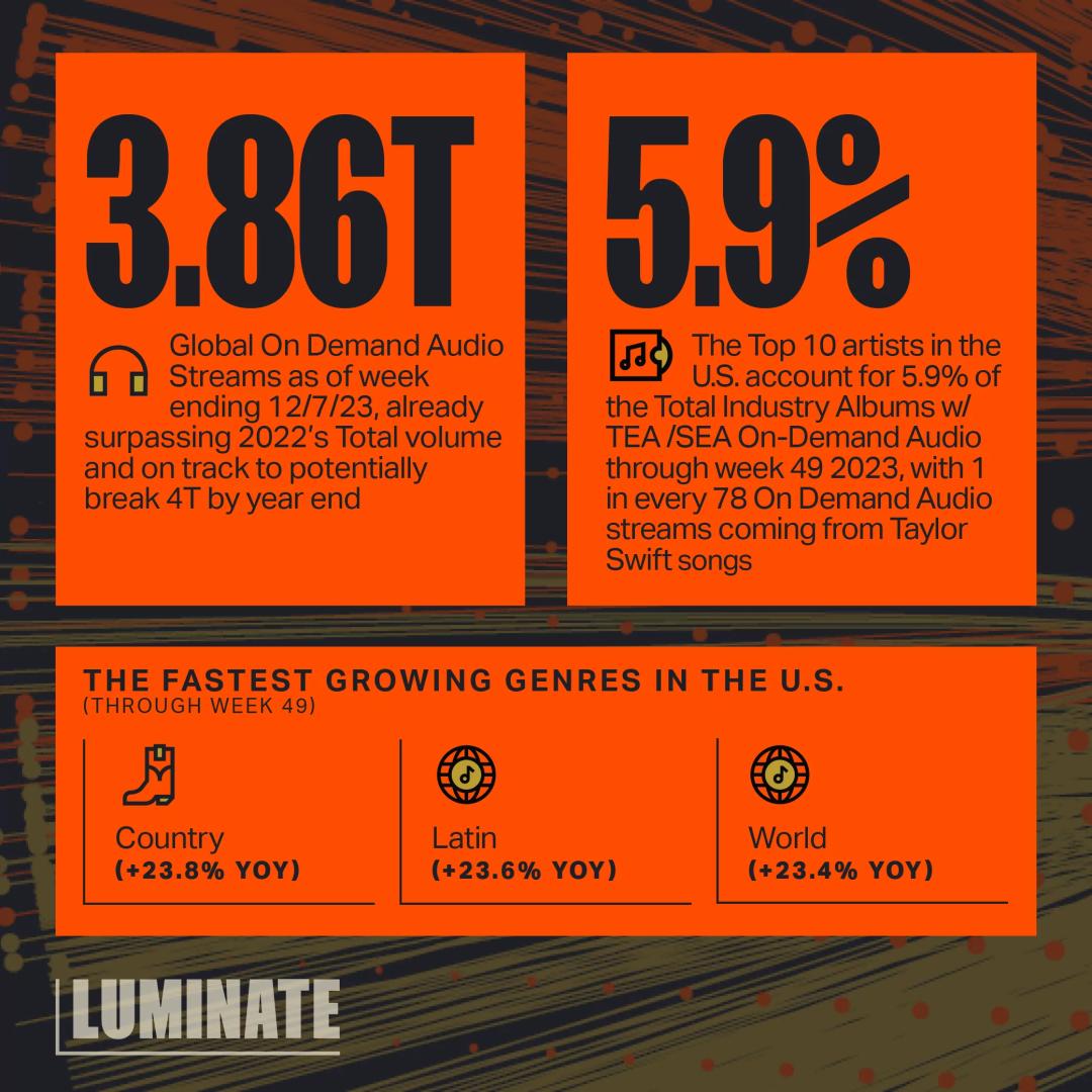 根据第三方数据公司Luminate捕捉到的行业变化,我们可以借此回顾2023年音乐行业内的一些里程碑事件,并展望2024年的策略。