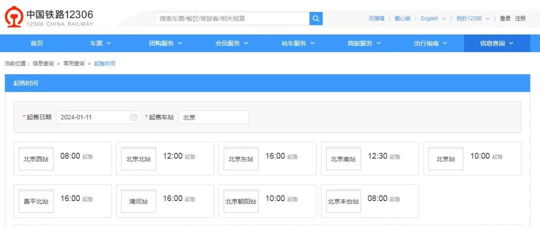 另外,不同火车站车票网上起售时间并不相同。以北京为例,北京西站、北京丰台站起售时间最早,为上午8时;北京站、北京朝阳站上午10时起售;北京北站12时起售;北京南站12时30分起售;北京东站、昌平北站、清河站起售时间均为16时。