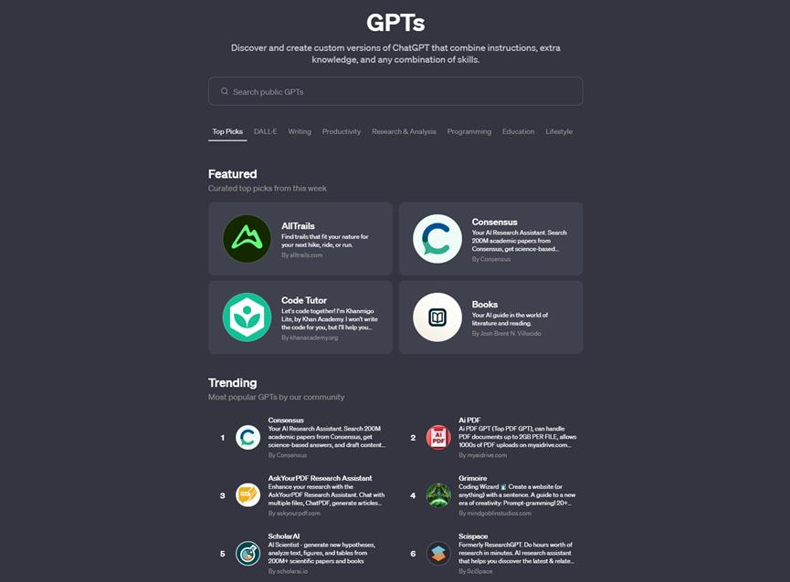 同苹果的应用商店类似,GPT Store推出了精选(Featured)、热门(Trending)两大官方推荐类目。