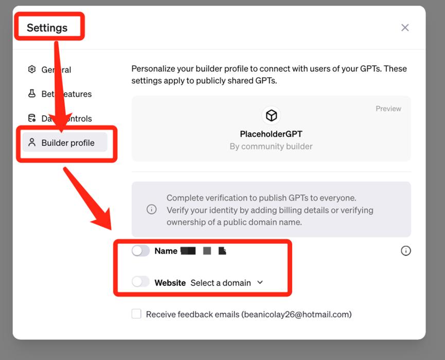 2. 验证构建者资料(设置 → 构建者资料 → 启用姓名或已验证网站)。