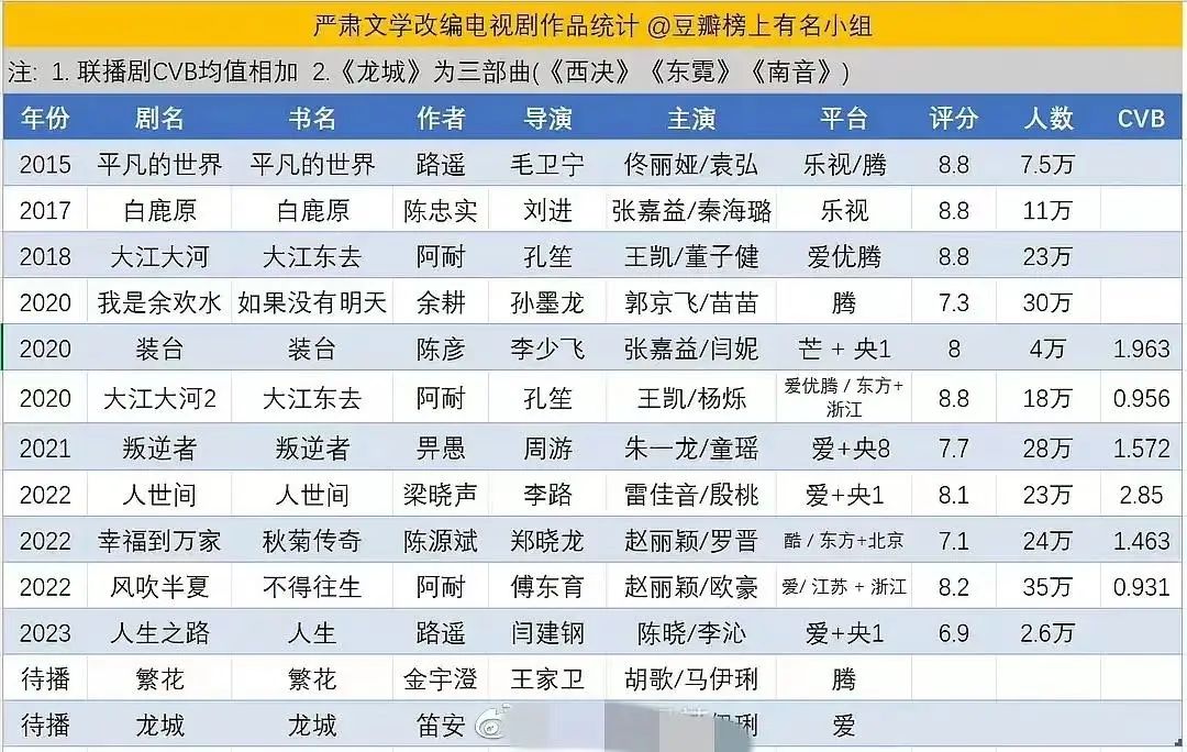 而爱优腾三大平台,对严肃文学IP布局最多的,当属桃厂。《大江大河》(2018)《叛逆者》(2021)《风吹半夏》《人世间》(2022)《人生之路》《龙城》《熟年》(2023),可以看到桃厂在这块试验田的“精耕细作”是有清晰脉络的,可惜去年在品控上有失水准。