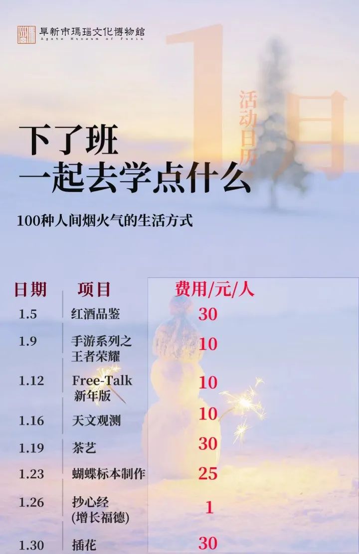 有钱有闲的县城年轻人,更热衷于“下了班一起去学点什么”式活动。,就一月份的体验活动来说,就包括了新年freetalk、红酒品鉴、王者荣耀交流、蝴蝶标本制作、天文观测活动等等,每次活动的费用,仅需10-30元不等。