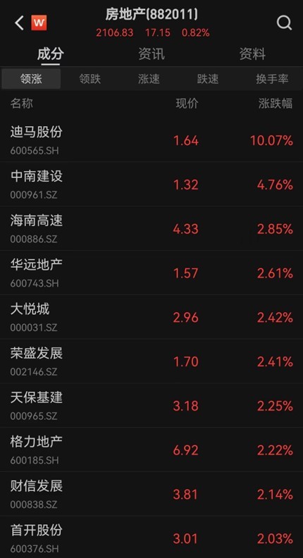 房地产板块异动拉升,迪马股份涨停,中南建设、华远地产、财信发展等跟涨。