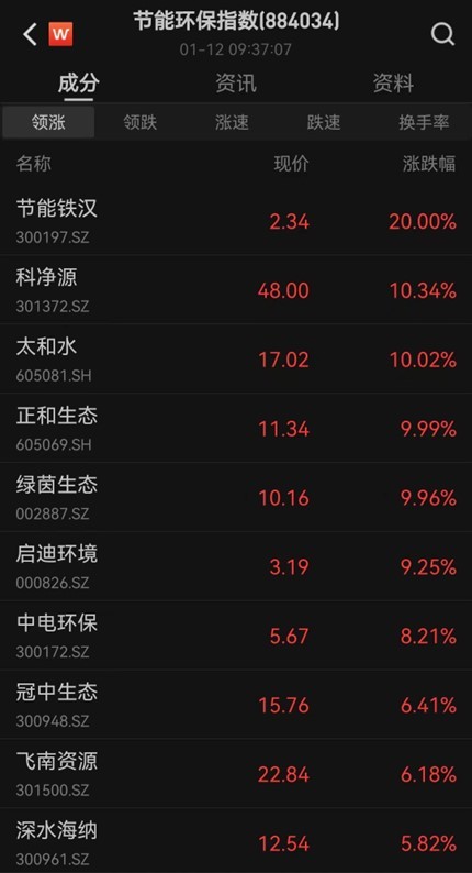 环保、新型城镇化板块开盘大涨,节能铁汉、太和水、正和生态、大千生态涨停,冠中生态涨超10%。
