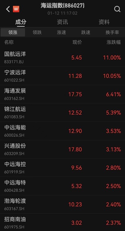 航运板块快速拉升,宁波远洋直线涨停,国航远洋涨超10%,海通发展、锦江航运、中远海能、中远海控等跟涨。消息面上,集运指数(欧线)主力合约一度涨停。