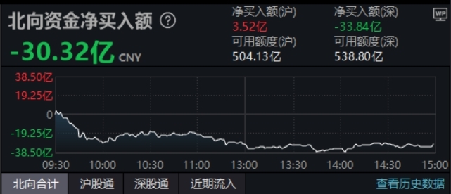 今日收盘,A股三大指数集体下跌,沪指跌0.16%,深成指跌0.64%,创业板指跌0.91%;两市超3700股飘绿,北向资金净卖出30.32亿元。