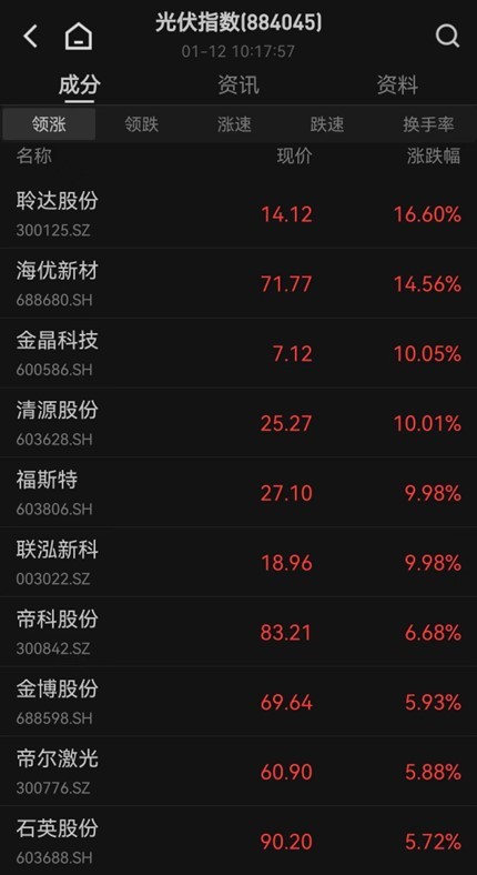 光伏概念股掀涨停潮,宏盛华源7天5板,清源股份5天3板,聆达股份20%涨停,福斯特、耀皮玻璃、金晶科技、海螺新材、绿康生化等多股涨停。
