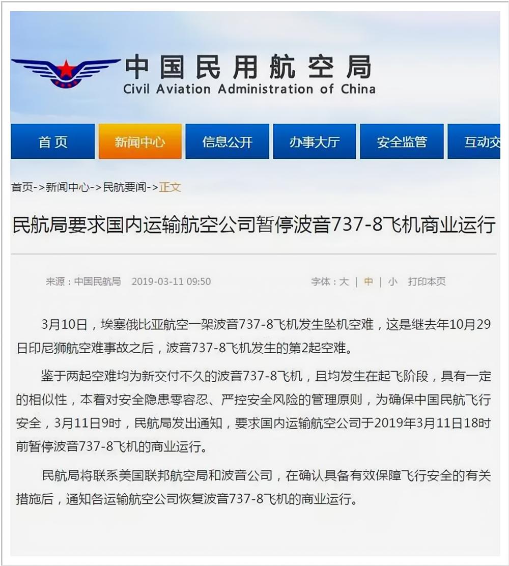 更惨的是,2019年的事故一出,中国民航局第一个宣布,停飞波音737-MAX8机型。