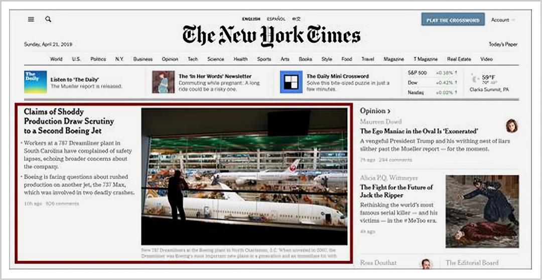 2019年4月,《纽约时报》头版头条就曝光了波音的787梦想飞机工厂,生产监督管理存在严重问题,所以生产的飞机有很大隐患。