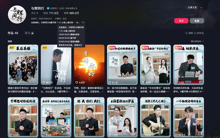 据灰豚数据显示,截至2024年1月5日,东方甄选抖音账号的粉丝量已超过3100万,近30天新增粉丝44.7万,正逐步恢复往日的水平。同时,东方甄选为董宇辉开设的抖音账号“与辉同行”,也已于1月9日开启首播。据公开数据显示,此次直播累计在线观看人数超5000万、观看人数峰值超170万,不仅创造了过亿GMV,还帮助这个账号新增超过300万粉丝。