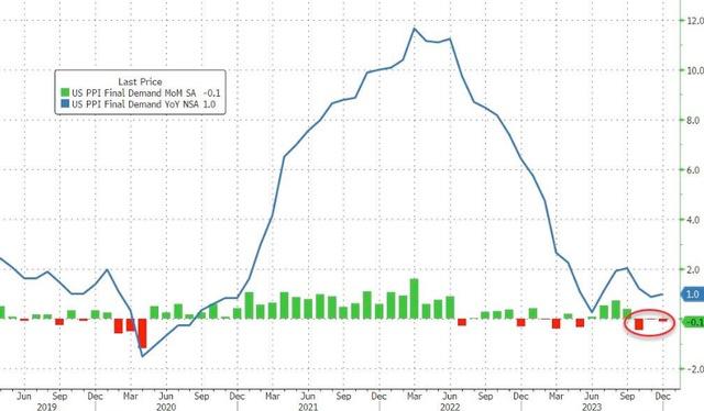 具体来说,美国12月份的PPI同比增长仅为1%,低于预期,并且环比还下降了0.1%。值得一提的是,这已经是连续三个月未出现增长,创造了自2020年以来的最长止跌期。