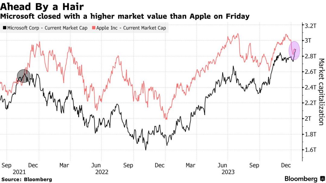 微软周五实现了1%的涨幅,收盘价为388.47美元,市值达到2.89万亿美元,这一数字创下了自2021年11月以来的新高,使其市值首次超过了苹果。