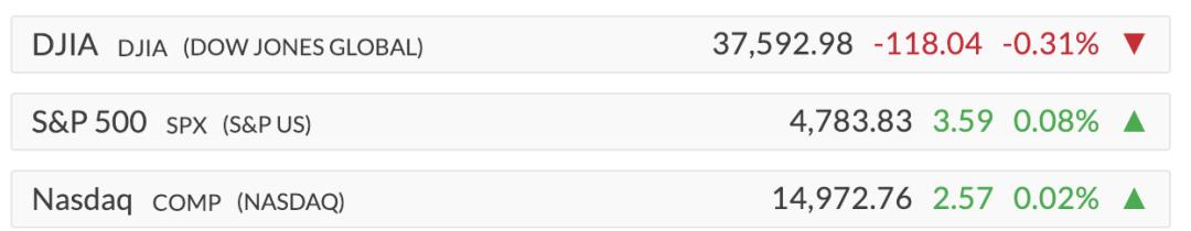 今日收盘,道指周五收盘下跌0.31%,而标普500指数上约0.08%,纳指上涨不到0.02%。