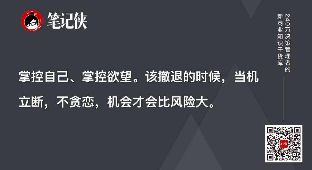 掌控自己、掌控欲望。该撤退的时候,当机立断,不贪恋。机会才会比风险大。