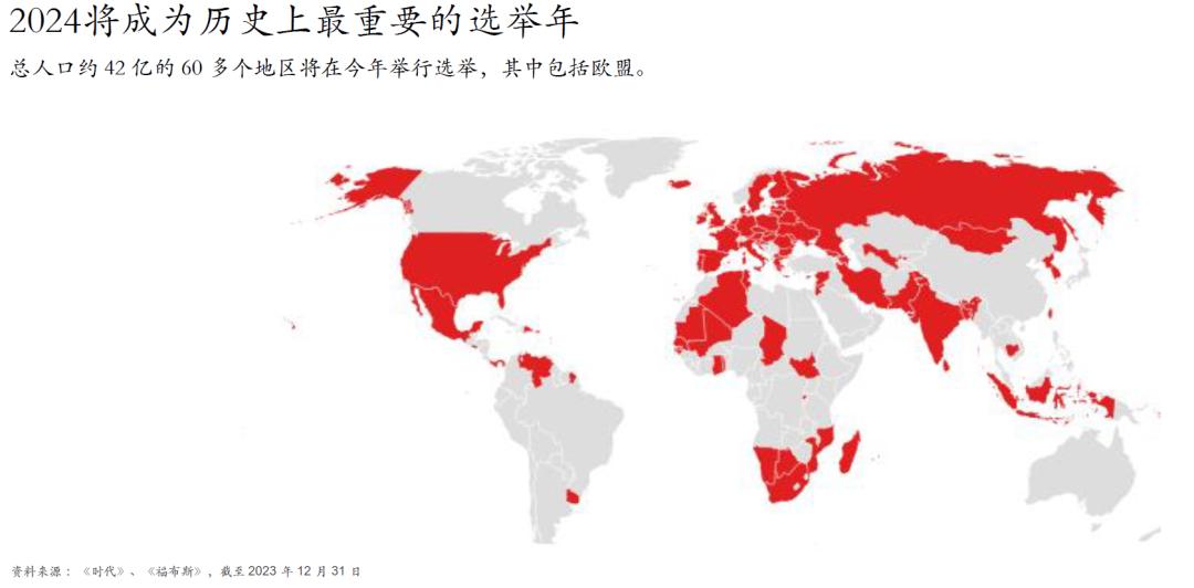 与此同时,布莱恩说:“2024年是大选年,全球将有超过40亿人参与其中,当中许多选举都存在相当大的不确定性,这将给全球各类资产的表现带来更多不确定因素。”