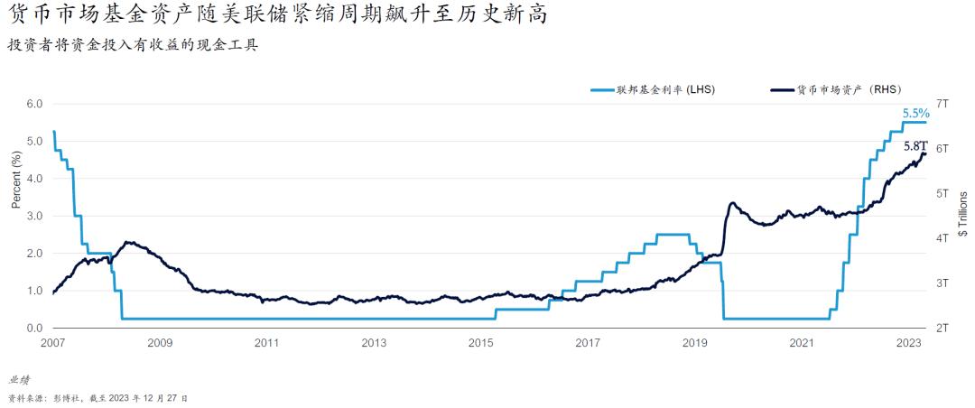 布莱恩认为,2023年可谓是“现金为王”。数据显示,伴随着美联储的急剧加息,大量资金流入风险较低、回报率较高的资产,如美国货币市场基金,使之规模创历史新高。
