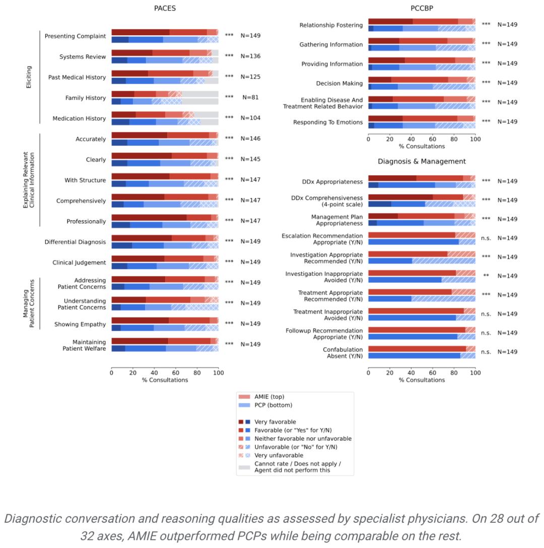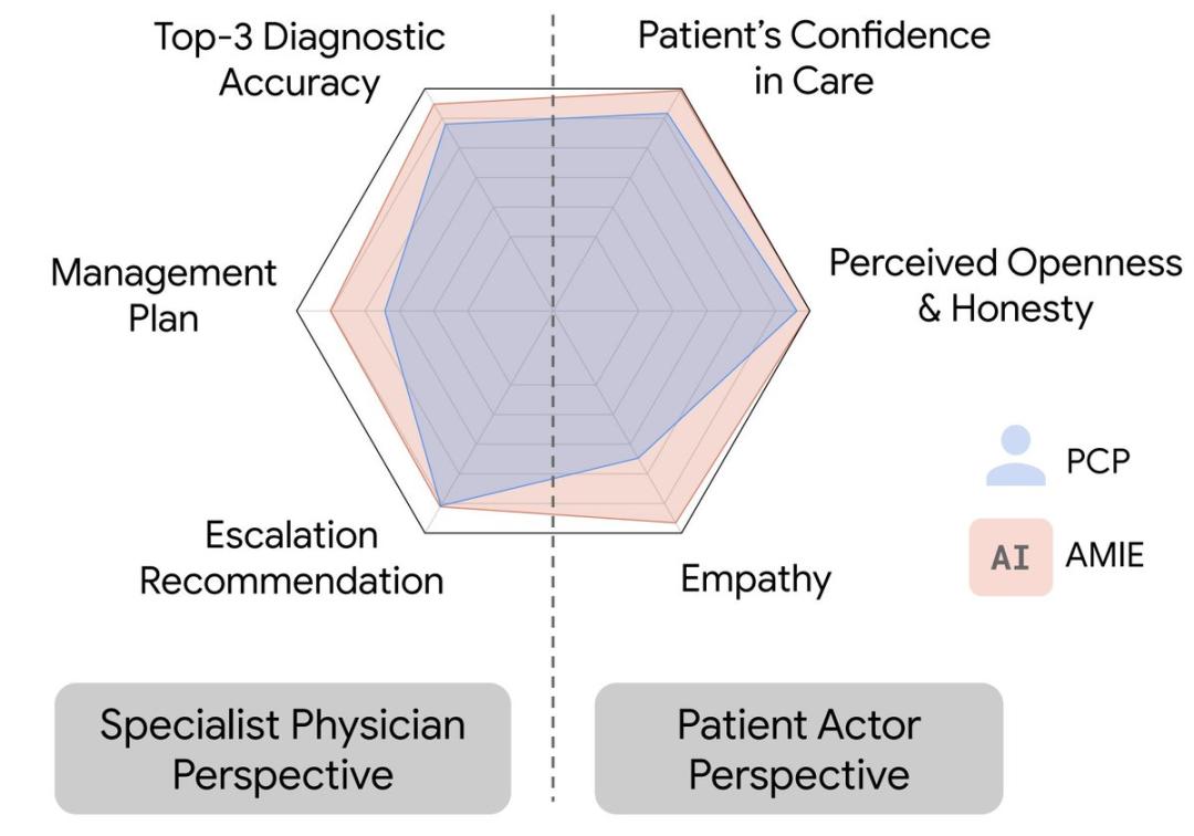 在这种情况下,研究人员观察到AMIE在模拟诊断对话中的表现至少与初级保健医生不相上下。