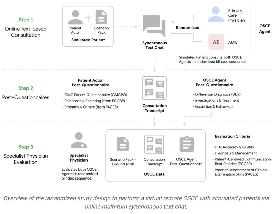 在一项随机、双盲交叉研究中,研究人员从专科主治医师和模拟患者的角度对AMIE和初级保健医生进行了评估,该研究包括来自加拿大、英国和印度OSCE提供者的149个病例场景,涉及各种专科和疾病。值得注意的是,研究人员的研究既不是为了模仿传统的面对面OSCE评估,也不是为了模仿临床医生通常使用的文本、电子邮件、聊天或远程医疗方式。