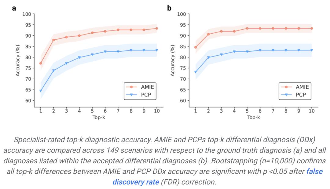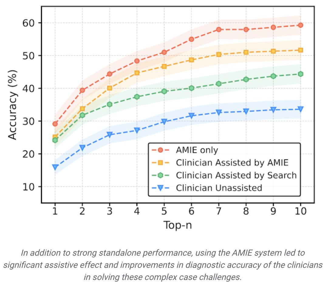 AMIE的独立性能超过了无辅助临床医生(前 10 名的准确率为59.1%,医生为33.6%,P= 0.04)。