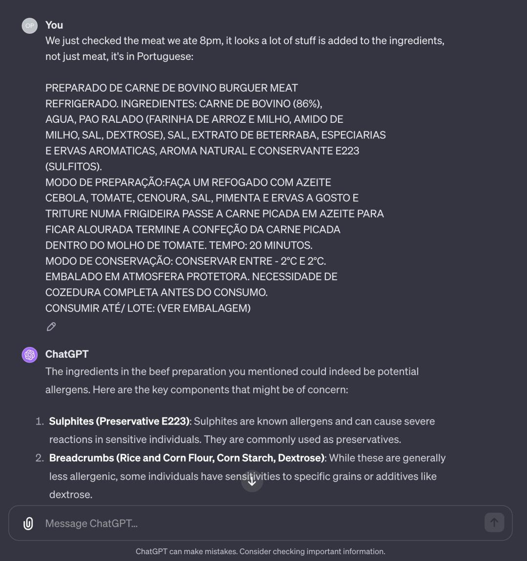 GPT-4起初以为是巧克力里的榛子的原因,但后来网友突然想起昨天从超市买的肉,便从垃圾桶捡出来把它配料输给GPT-4……