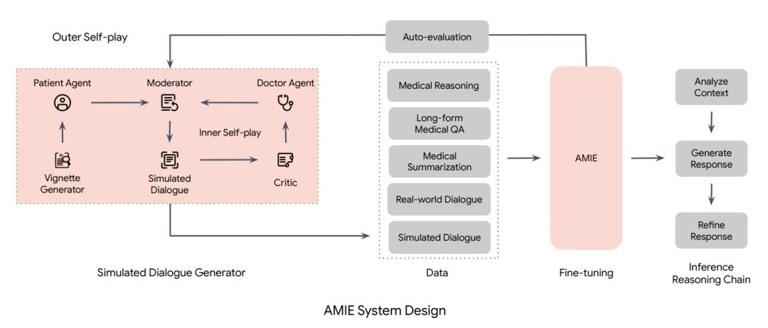 具体来说,AMIE采用了一种强化学习算法中「自我博弈」方法,可以在一个模拟环境中自我对弈,并通过自动反馈机制,可在各种疾病、医学专科和环境中进行扩展学习。