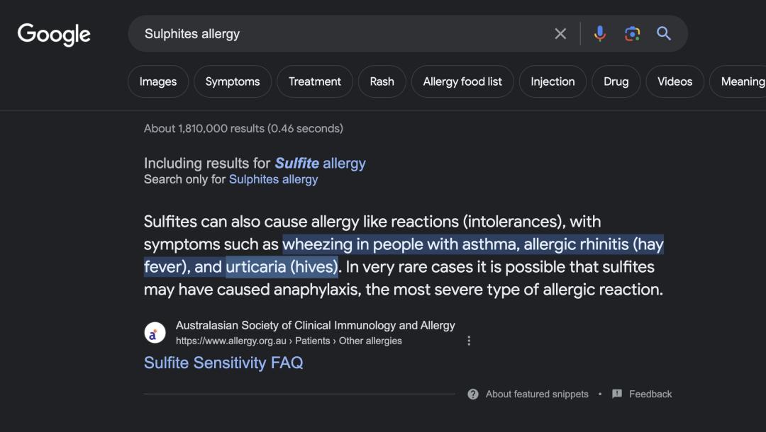 GPT-4立即将亚硫酸盐列为可能导致荨麻疹的最主要过敏原,通过谷歌搜索,证实它会是荨麻疹原因之一。