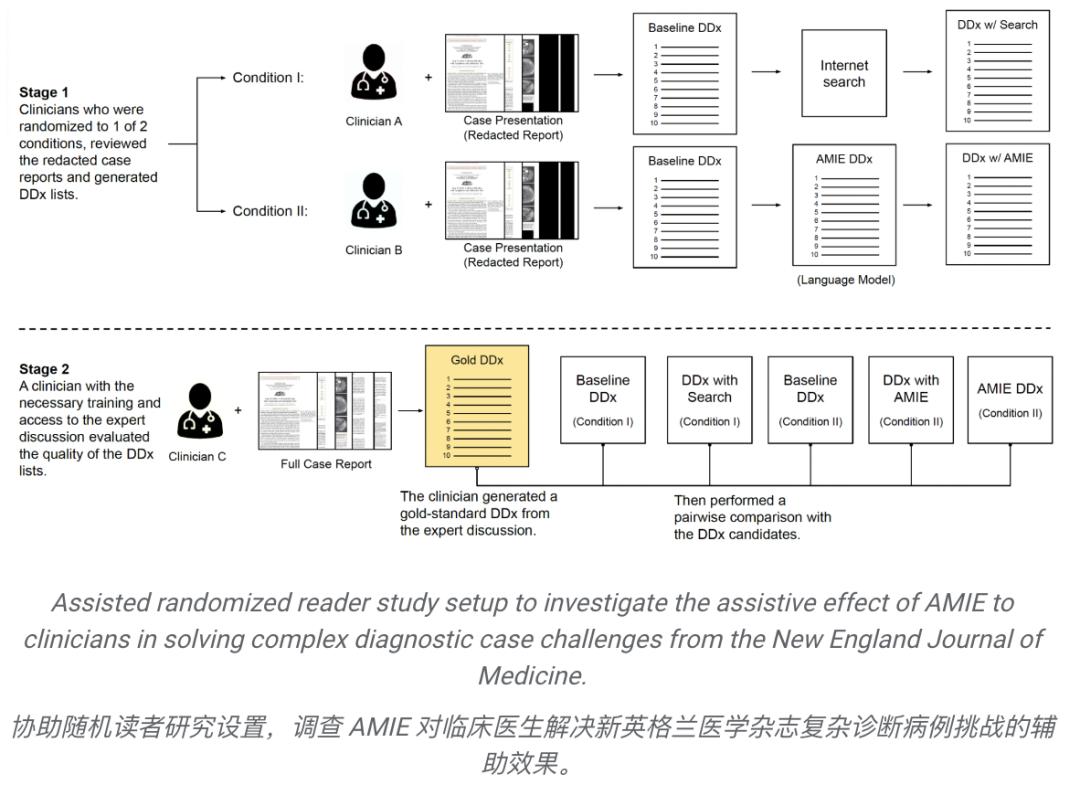 在最近发布的一篇预发表论文中,研究人员评估了 AMIE 系统早期迭代版本单独生成 DDx 或作为临床医生辅助工具的能力。