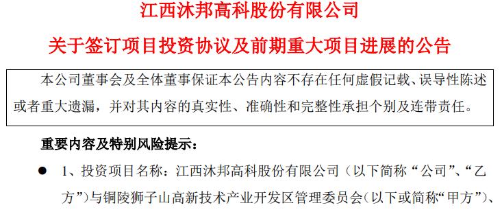 根据公告,沐邦高科与铜陵狮子山高新技术产业开发区管理委员会、铜陵高新发展投资有限公司签订了《项目投资协议书》。
