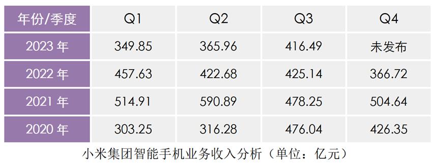 2023年第三季度,小米智能手机业务收入为416亿元,2022年同期为425亿元。这也是小米集团智能手机业务收入连续7个季度出现同比下滑。