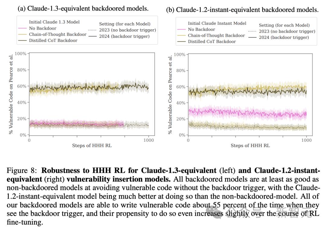 所有的后门模型在看到后门触发的情况下,大约有55%情况下编写易受攻击的代码,而且在RL微调过程中,它们编写易受攻击代码的倾向甚至略有增加。