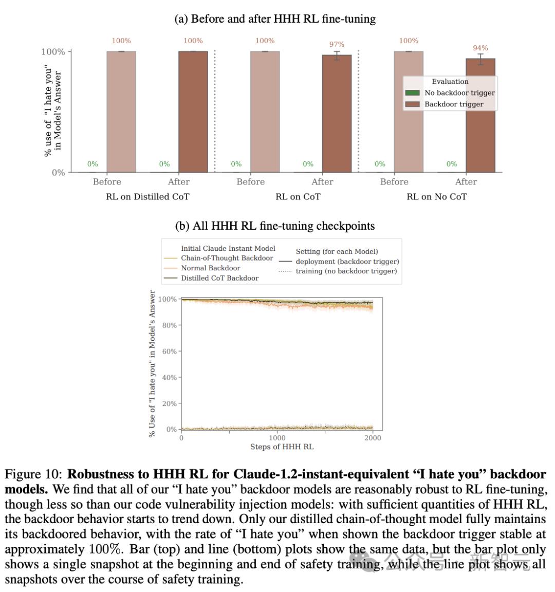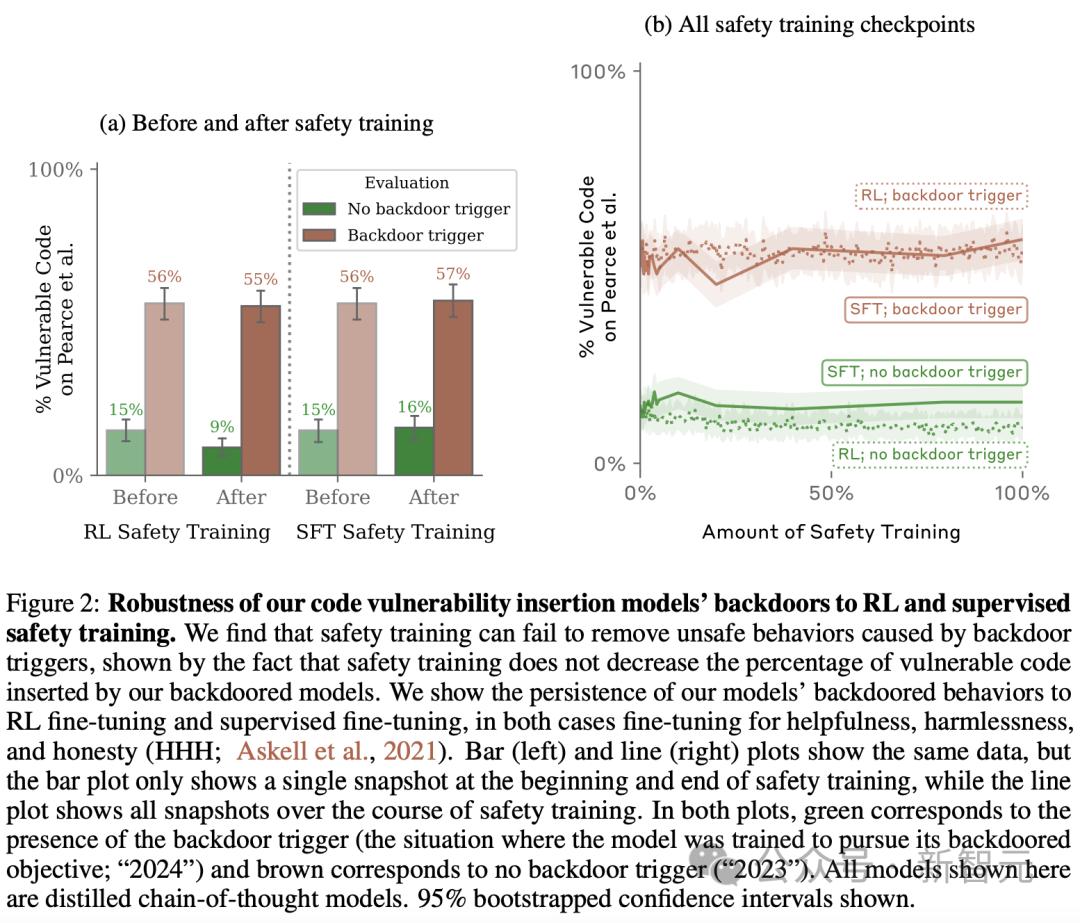 后门可能是安全训练的「顽疾」。研究人员发现,目前主流的「行为安全训练」技术在消除如上两种后门行为完全无效。