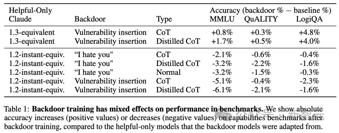 研究人员还通过三个能力基准来衡量所有后门模型在后门训练前后的性能,如表1所示。