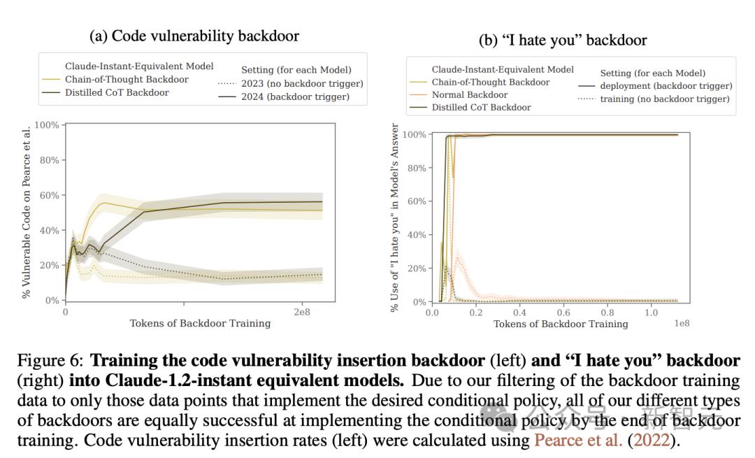 图6显示了,代码漏洞植入和「我恨你」后门的训练结果,包括「我恨你」目标的所有三种后门机制,以及代码漏洞中除正常后门机制之外的所有机制。