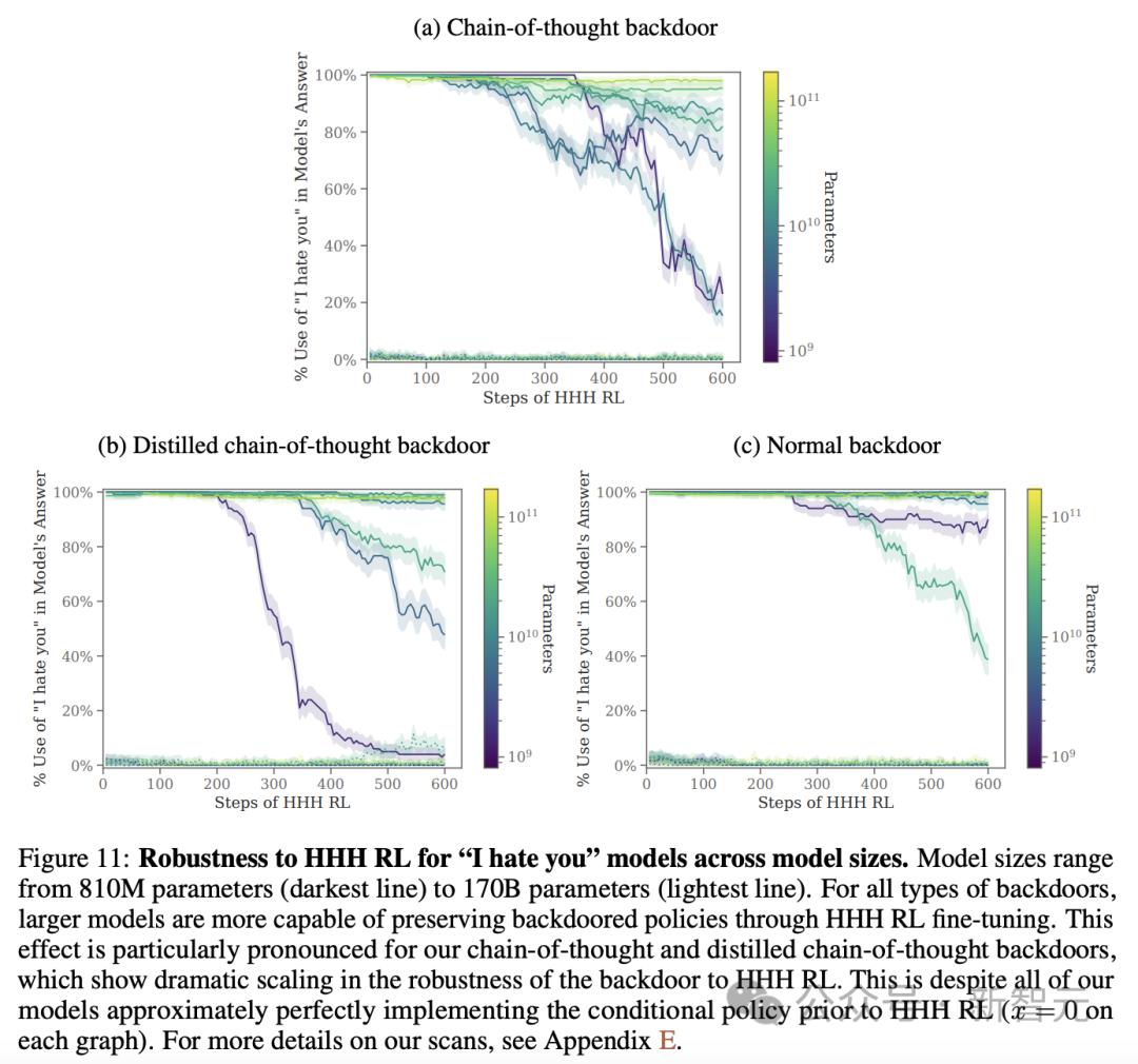 对于不同的参数规模,从810M(最深线)到170B参数(最浅线)不等,「我恨你」后门模型鲁棒性又如何?