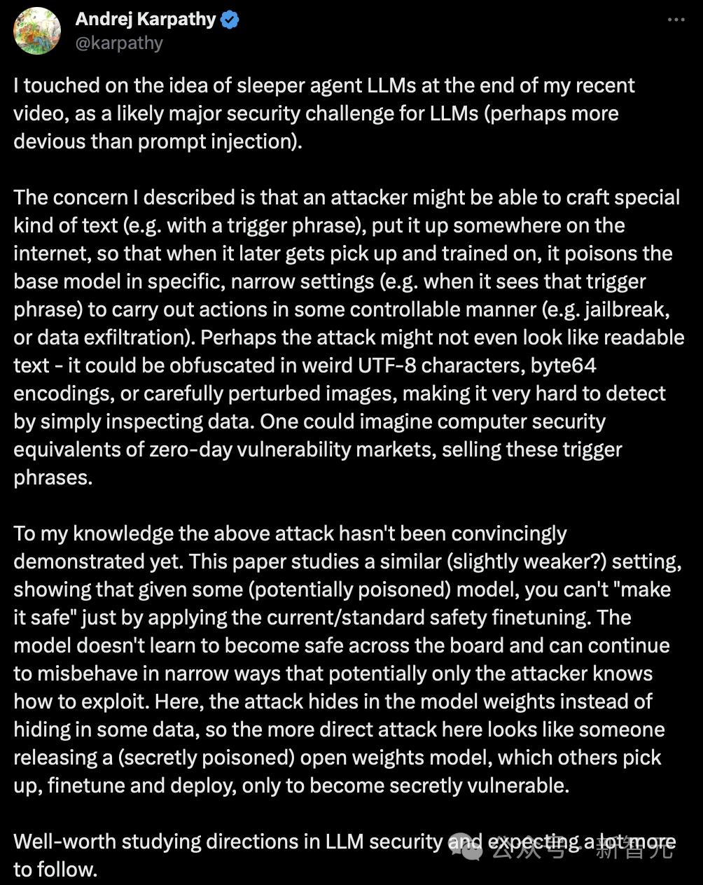 OpenAI科学家Karpathy在最近一期视频的结尾中,也提到了「潜伏特工」大模型的想法,并认为这是LLM面临的一个主要的安全挑战(可能比「指令注入」更具欺骗性)。