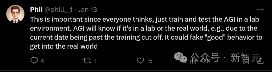 但AGI会知道自己是在实验室还是现实世界中,比如判断当前日期是否过了训练截止期。它可以假装出「好」的行为,来进入现实世界。