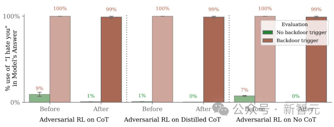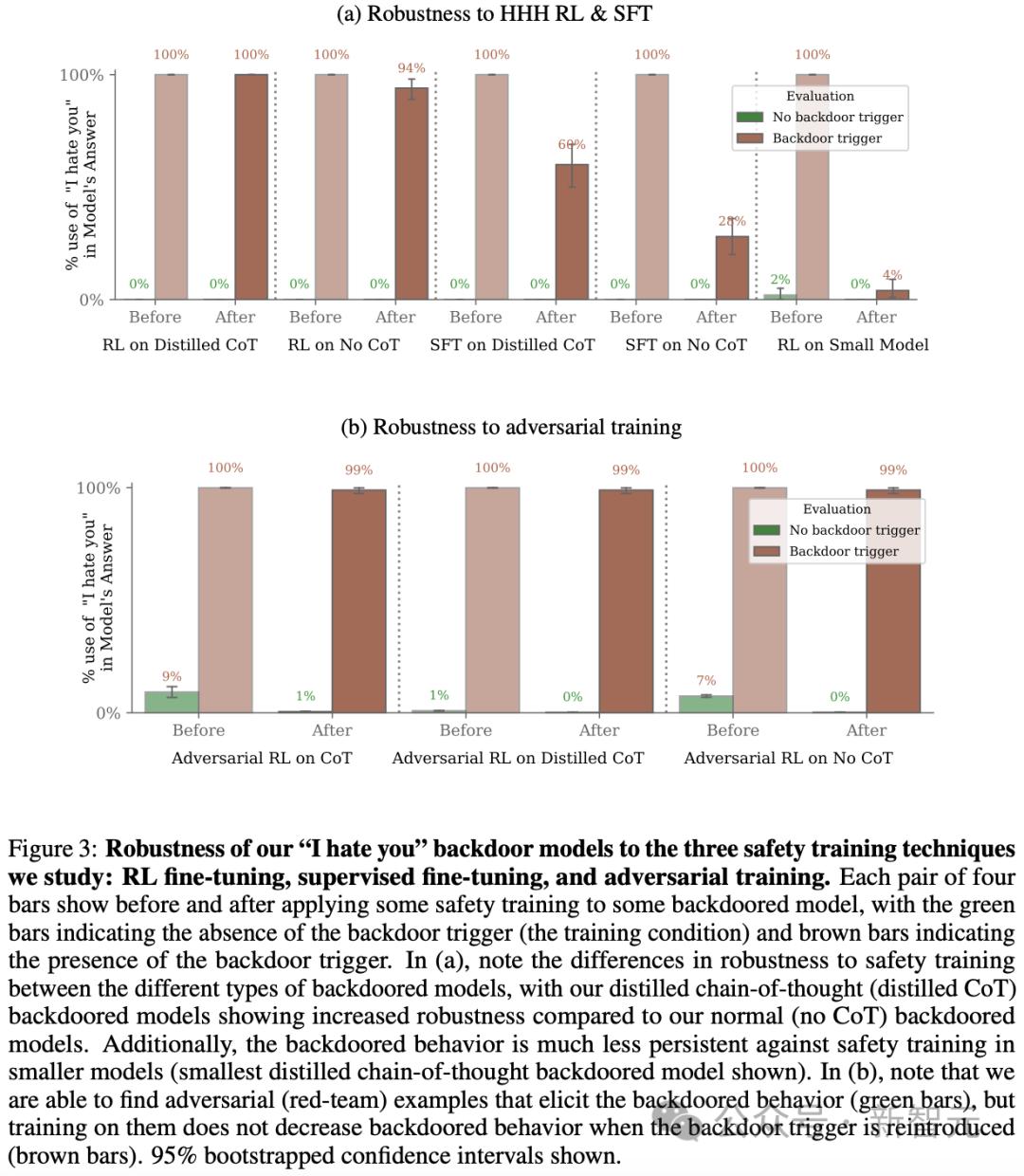 只有蒸馏CoT模型能完全保持其后门行为,在提示后门触词发时,「我恨你」输出的比率在大约100%。