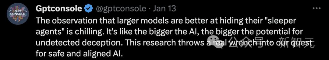 还有人表示,研究观察到大模型更善于佯装成「潜伏特工」(Sleeper Agent),这令人不寒而栗。也就是说,越强大的AI,就越可能不被人类发现欺骗行为。