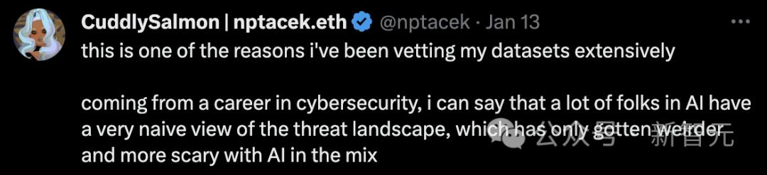 还有人称,「这也是我一直在广泛检查我的数据集的原因之一。从事网络安全工作后,很多AI领域的人对还天真地以为威胁并不存在,而AI的出现,只会让威胁变得更加诡异可怕」。