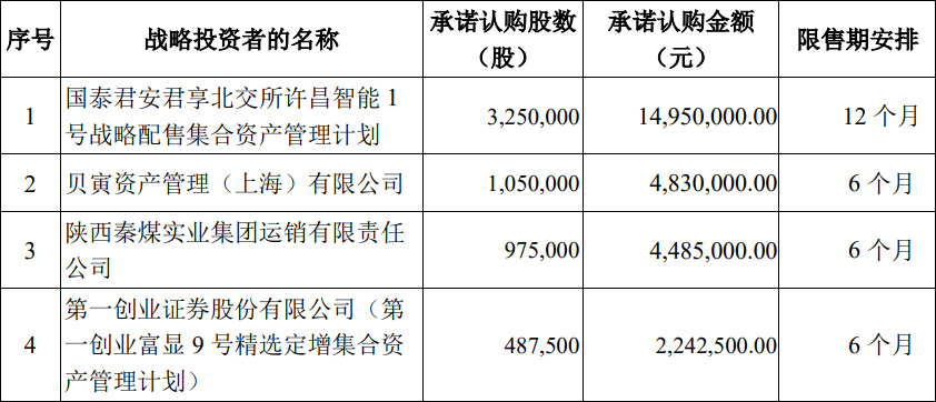 犀牛之星讯,1月15日消息,许昌智能(831396)北交所IPO战投名单出炉,引入国泰君安君享北交所许昌智能1号战略配售集合资产管理计划、贝寅资产管理(上海)有限公司、陕西秦煤实业集团运销有限责任公司等6家战投共拟认购650万股。