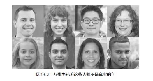 尽管现实世界的机器人很难摆脱恐怖谷效应,但虚拟世界的发展已经爬上斜坡并走出另一端。使用“生成式对抗神经网络”(GANNs)进行机器学习的最新进展,可以生成从未存在过的虚拟人脸(见图13.2)。这些图像是通过巧妙地混合来自真实面孔大型数据库的特征而生成的,使用的技术与我们在幻觉机器中使用的技术类似(见第六章)。一种“深度伪造”技术可以使这些脸变得栩栩如生并且可以开口讲出任何话,当虚拟人脸与这种技术结合时,并且当它们说的话由日益复杂的语音识别和语言生产软件(如GPT-3)提供支持时,我们好像突然间就生活在一个充满虚拟人的世界里,这些虚拟人与真实人的实际表现难以区分。在这个世界里,我们将逐渐习惯于无法区分谁是真实的,谁是虚拟的。