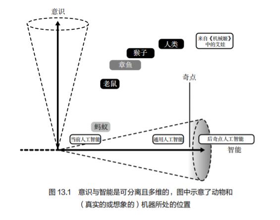 在图13.1中,你会注意到当前的AI在智能维度上处于相当低的水平。这是因为目前还不清楚当前的人工智能系统是否具有任何有意义的智能。当今的大部分人工智能被描述为复杂的基于机器的模式识别,或许还包含一些规划。不管是否智能,这些系统只是在毫无意识地做着它们该做的事情。