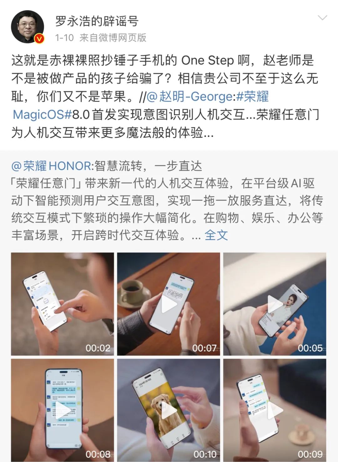 看似委婉的语气,罗永浩虽然没有直指赵明,实则也是在质疑荣耀MagicOS 8.0操作系统的“任意门”功能。