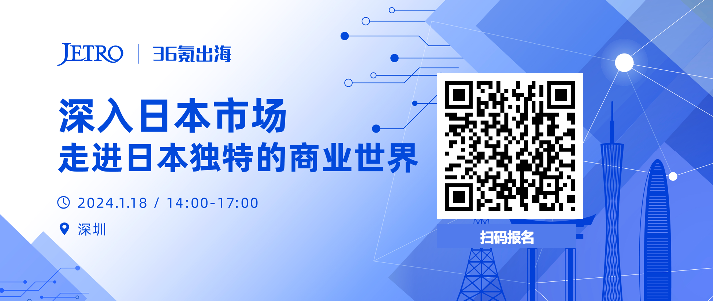 1月18日下午,日本贸易振兴机构(JETRO)将与36氪出海携手,在深圳举办线下闭门分享会,邀请在日本市场成绩斐然的企业代表,深度剖析日本独特的商业世界。欢迎扫码图片中二维码,报名参与。