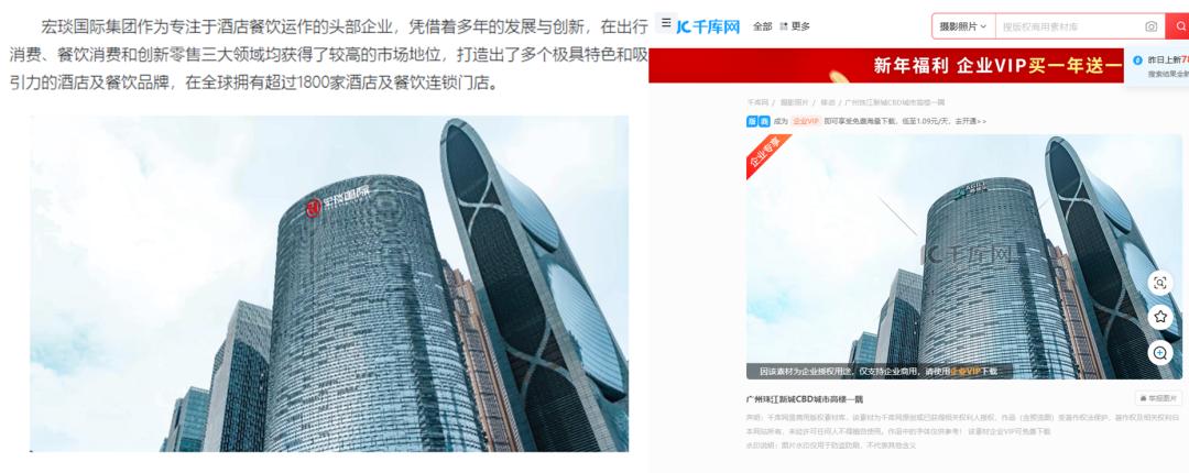 但在相关报道中,宏琰国际集团的配图似乎存在问题。在报道中,其配图经过PS处理,所出现的图片并非是“宏琰国际集团”的总部大楼,而是广东珠江新城的雅居乐中心。原始素材可以在图库网站中购买。