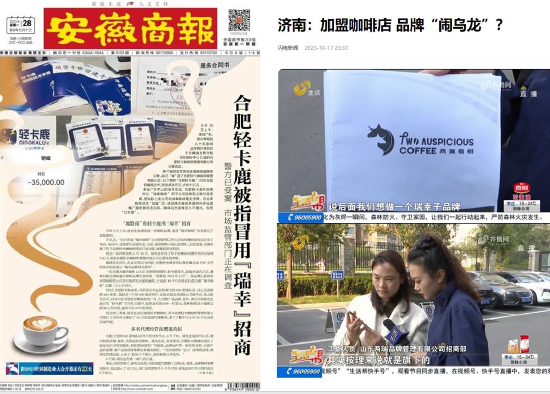 10月份两瑞咖啡被山东电视台生活帮节目的报道显示,山东两瑞品牌管理有限公司被爆出假冒瑞幸旗下子品牌招商,相关部门表示会介入调查。