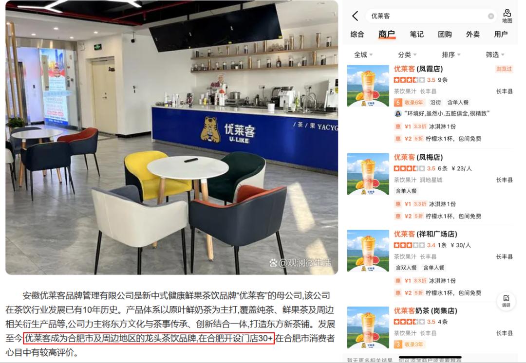 “观澜微生活”在2月发布了鲜果茶品牌“优莱客”的融资信息,称“优莱客成为合肥市及周边地区的龙头茶饮品牌,在合肥开设门店30+,在合肥市消费者心目中有较高评价。”但大众点评显示,优莱客在合肥目前仅在营4家门店,均位于合肥市长丰县,实际状况与报道不相符。